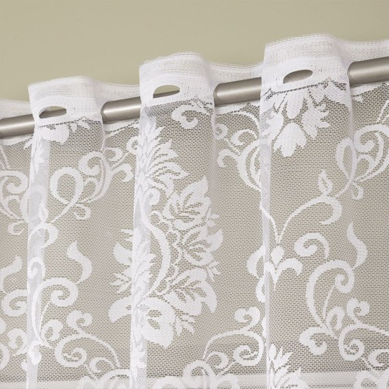 Firanka w białym kolorze z bogatym, florystycznym wzorem po całości. Dół firanki wykończony jest fabrycznie w kształt chmurki.