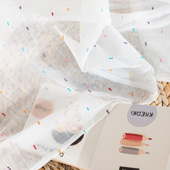 Firanka z kolorowym haftem po całości, wygląda jak obsypana posypką do ciast. Cukierkowe kolory sprawiaja, że idealnie pasuje do pokoju dziecięcego i młodzieżowego. Wprowadzi wesoły akcent i pozytywnie wpłynie na nastrój domowników.
