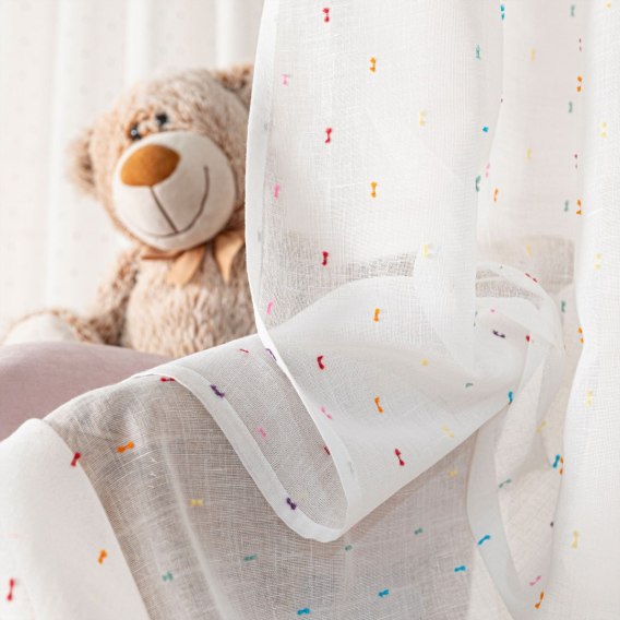 Firanka z kolorowym haftem po całości, wygląda jak obsypana posypką do ciast. Cukierkowe kolory sprawiaja, że idealnie pasuje do pokoju dziecięcego i młodzieżowego. Wprowadzi wesoły akcent i pozytywnie wpłynie na nastrój domowników.