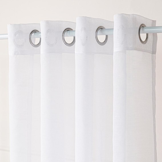 Firana na srebrnych przelotkach. Gotowa do zawieszeia bezpośrednio na karniszu rurkowym. Umożliwia łatwy i szybki montaż we wnęce okiennej, by od razu cieszyć oko udaną dekoracją.