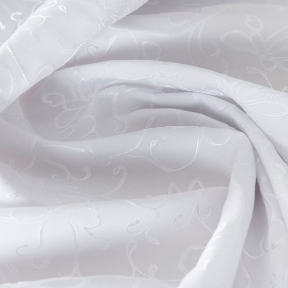 Elegancki obrus z florystycznymi, fantazyjnymi zawijasami po całości z brzegami wytopionymi ozdobną chmurką.