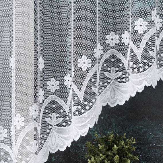 Firanka o dużym oczku, tworzącym nieregularną siateczkę o wzorze pasowym umieszczonym głównie u dołu, ozdobiona dodatkowo pasami pojedynczych kwiatków.
