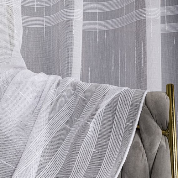 Firanka siateczka o drobnym oczku w stylu natural look, urozmaicona po całości pionowymi przeszyciami, dającymi efekt deszczyku. U dołu ozdobiona poziomymi pasami, wykonanymi z domieszką błyszczącej nici w srebrnym kolorze.