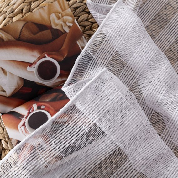 Firanka siateczka o drobnym oczku w stylu natural look, urozmaicona po całości pionowymi przeszyciami, dającymi efekt deszczyku. U dołu ozdobiona poziomymi pasami, wykonanymi z domieszką błyszczącej nici.