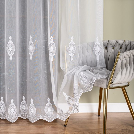 Haft o eleganckim, abstrakcyjnym motywie został dodatkowo wyeksponowany przez użycie szarej nici. Doda luksusowego akcentu, bez przesadnego przepychu. Całość dekoracji jest zwiewna i nie ogranicza widoku z okna. Pomimo znacznej wysokości, nie przytłacza, a misterny haft przy dolnej krawędzi wciąż przyciąga wzrok.