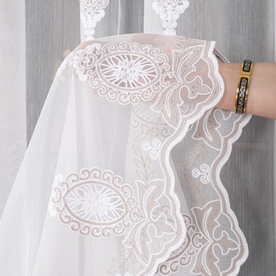 Haft o eleganckim, abstrakcyjnym motywie został dodatkowo wyeksponowany przez użycie beżowej nici. Doda luksusowego akcentu, bez przesadnego przepychu. Całość dekoracji jest zwiewna i nie ogranicza widoku z okna. Pomimo znacznej wysokości, nie przytłacza, a misterny haft przy dolnej krawędzi wciąż przyciąga wzrok.