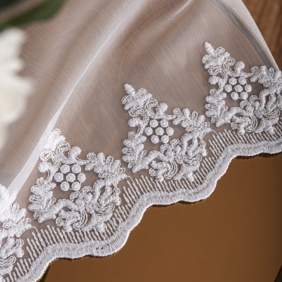 Haft o eleganckim, abstrakcyjnym motywie został wykonany przy użyciu błyszczącej nici, dlatego pięknie mieni się w świetle. Doda luksusowego akcentu, bez przesadnego przepychu do klasycznych wnętrz. Całość dekoracji jest zwiewna i nie ogranicza widoku z okna. Pomimo znacznej wysokości, nie przytłacza, a misterny haft przy dolnej krawędzi wciąż przyciąga wzrok.