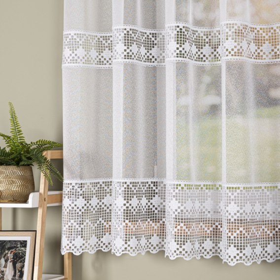 Gładka firanka z efektem mrozu na całości z aplikacją w dolnej części. Aplikacja o wzorze geometrycznym na bazie drobnych kwadratów dodatkowo dociąża tkaninę, dzięki czemu firanka ładnie się układa.