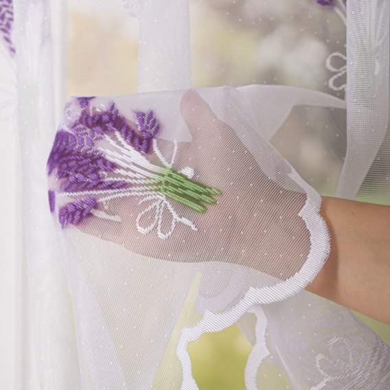 Firanka żakardowa z pasowym wzorem po całości w fioletowe i białe bukiety kwiatów polnych, wykończona u dołu w kształt chmurki.