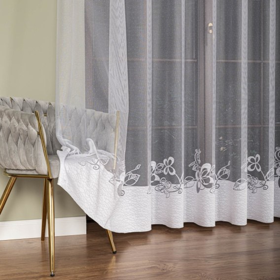 Główną ozdobą firanki jest pas florystycznego wzoru w jej dolnej części, zakończony abstrakcyjną moziką o gęstym splocie, jednak uroku dodają jej również drobne kropeczki symetrycznie rozmieszczone po całej powierzchni.