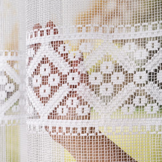Firanka żakardowa, siateczka o wyraźnym, dużym oczku z geometrycznym wzorem pasowym, u dołu wykończona schodkowo.