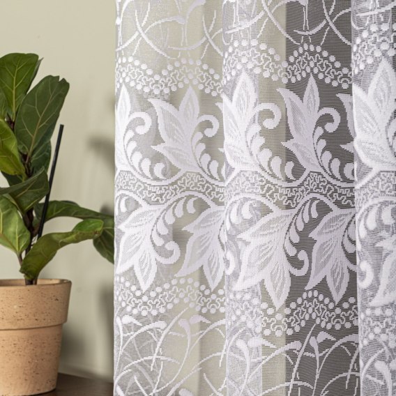 Biała firanka żakardowa z florystycznym wzorem pasowym, urozmaiconym abstrakcyjnymi liniami po całości, u dołu wykończona w kształt chmurki.
