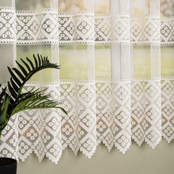 Firanka żakardowa, siateczka o wyraźnym, dużym oczku z geometrycznym wzorem pasowym, u dołu wykończona schodkowo.