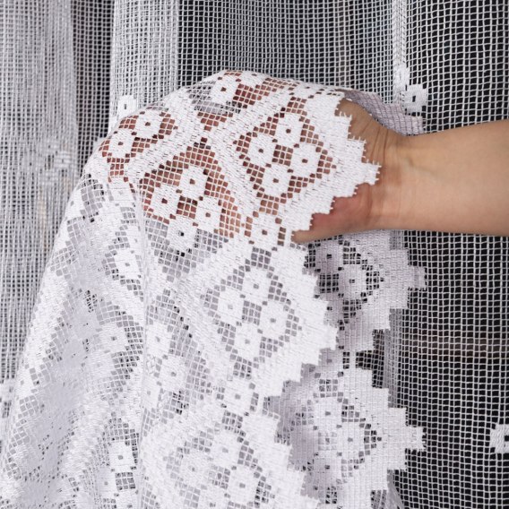 Firanka żakardowa, siateczka o wyraźnym, dużym oczku z geometrycznym wzorem pasowym, u dołu wykończona schodkowo.