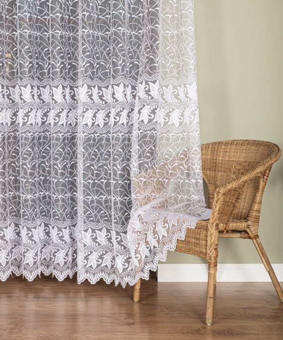 Biała firanka żakardowa z florystycznym wzorem pasowym, urozmaiconym abstrakcyjnymi liniami po całości, u dołu wykończona w kształt chmurki.