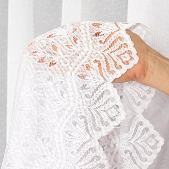 Gęsta firanka, dobrze kryjąca widok z okna. Urozmaicona delikatnym deszczykiem po całości, wykończona schodkowo z uroczym, ażurowym wzorem pasowym u dołu.