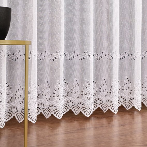 Gęsta firanka, dobrze kryjąca widok z okna. Urozmaicona delikatnym deszczykiem po całości, wykończona schodkowo z uroczym, ażurowym wzorem pasowym u dołu.