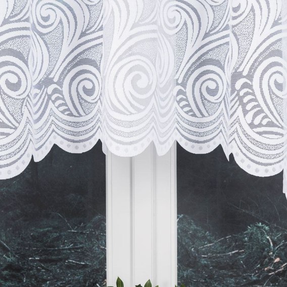 Biała firanka gotowa, profilowana po łuku z bogatym wzorem przypominającym morskie fale.