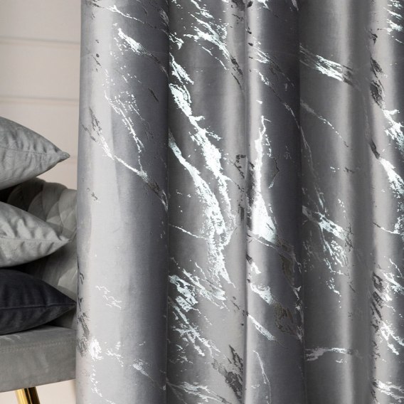 Elegancka zasłona welwetowa z subtelnym, błyszczącym nadrukiem w kolorze srebra, inspirowanym abstrakcyjnym żyłkowaniem marmuru. Jednostronny, drukowany wzór i lekki połysk welwetu nadaje materiałowi luksusowy wygląd, perfekcyjnie komponując się ze stylem glamour i jego nowoczesnymi odmianami.