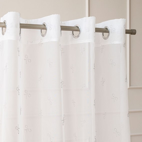 Urocza firanka etamina haftowana jest w drobne diamentowe kokardki. Jej lekka materia przepuści dużo promieni słonecznych do wnętrza. Radosny wzór wprowadzi pozytywny nastrój do każdego pokoju w Twoim domu.