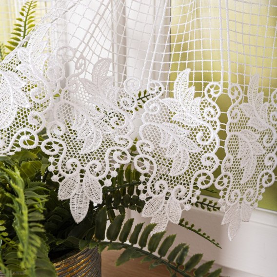 Dzięki fabrycznie przygotowanym oczkom u góry, firanka jest przystosowana do zawieszenia na mini karniszu do zazdrostek. Panelowy układ wzoru wydziela indywidualne segmenty, które po odcięciu, nie wymagają obrębiania i od razu stanowią gotową do zawieszenia zazdrostkę.