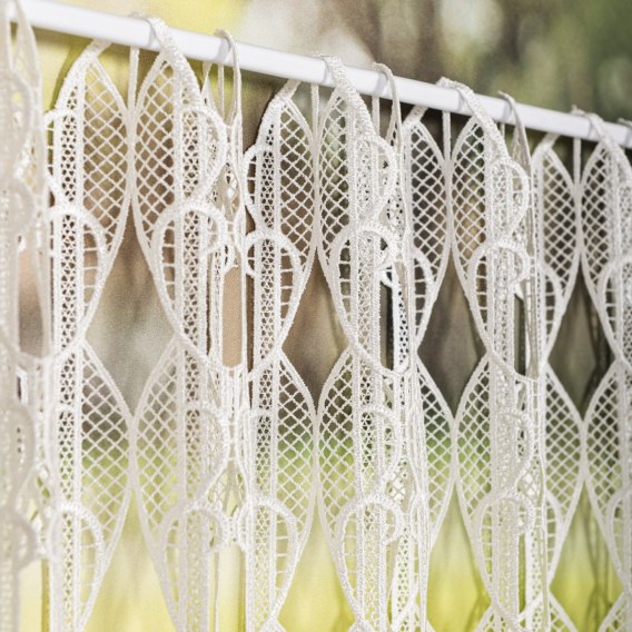 Dzięki fabrycznie przygotowanym oczkom u góry, firanka jest przystosowana do zawieszenia na mini karniszu do zazdrostek. Panelowy układ wzoru wydziela indywidualne segmenty, które po odcięciu, nie wymagają obrębiania i od razu stanowią gotową do zawieszenia zazdrostkę.