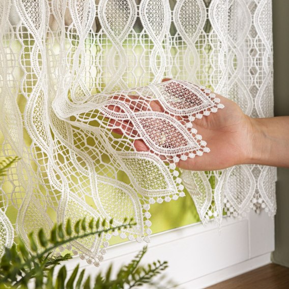 Dzięki fabrycznie przygotowanym oczkom u góry, firanka jest przystosowana do zawieszenia na mini karniszu do zazdrostek. Panelowy układ wzoru wydziela indywidualne segmenty, które po odcięciu, nie wymagają obrębiania i od razu stanowią gotową do zawieszenia zazdrostkę.