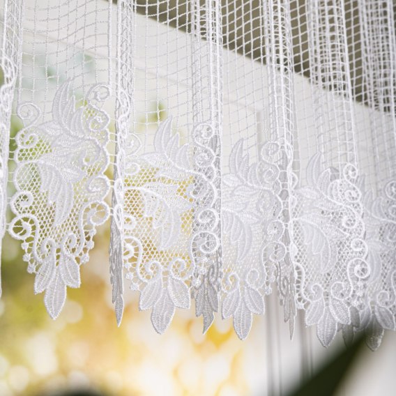Dzięki fabrycznie przygotowanym oczkom u góry, firanka jest przystosowana do zawieszenia na mini karniszu do zazdrostek. Panelowy układ wzoru wydziela indywidualne segmenty, które po odcięciu, nie wymagają obrębiania i od razu stanowią gotową do zawieszenia zazdrostkę.