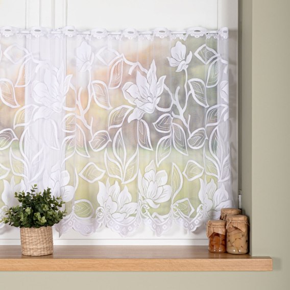 Dzięki fabrycznie przygotowanym oczkom u góry, firanka jest przystosowana do zawieszenia na mini karniszu do zazdrostek.